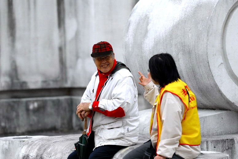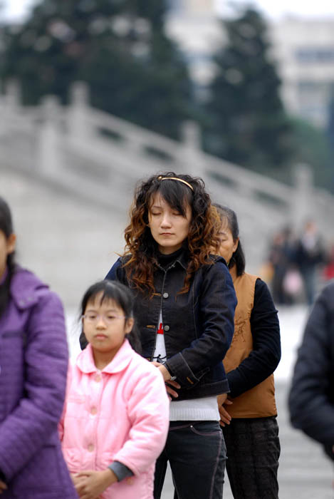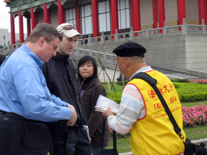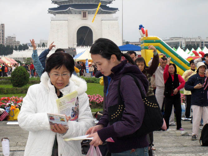 假日的中正纪念堂游人如织,来自中国大陆的游客经过炼功的法轮功学员时总是目不转睛,趁机偷偷的拍照,有的人太紧张,居然跟旁边的同伴说:奇怪,我的照象机怎么没办法把法轮功照下来。有一位大陆新娘跟学员说:我相信法轮功学员被活摘器官的事,因为中共草菅人命向来如此。她的丈夫接受了《·九·评*》,很认真的在一旁看了起来。