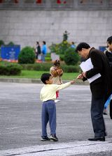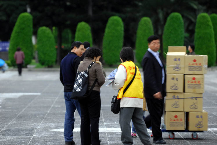 ![]() 法轮功小弟子也一起发简介书签给过往民众 |