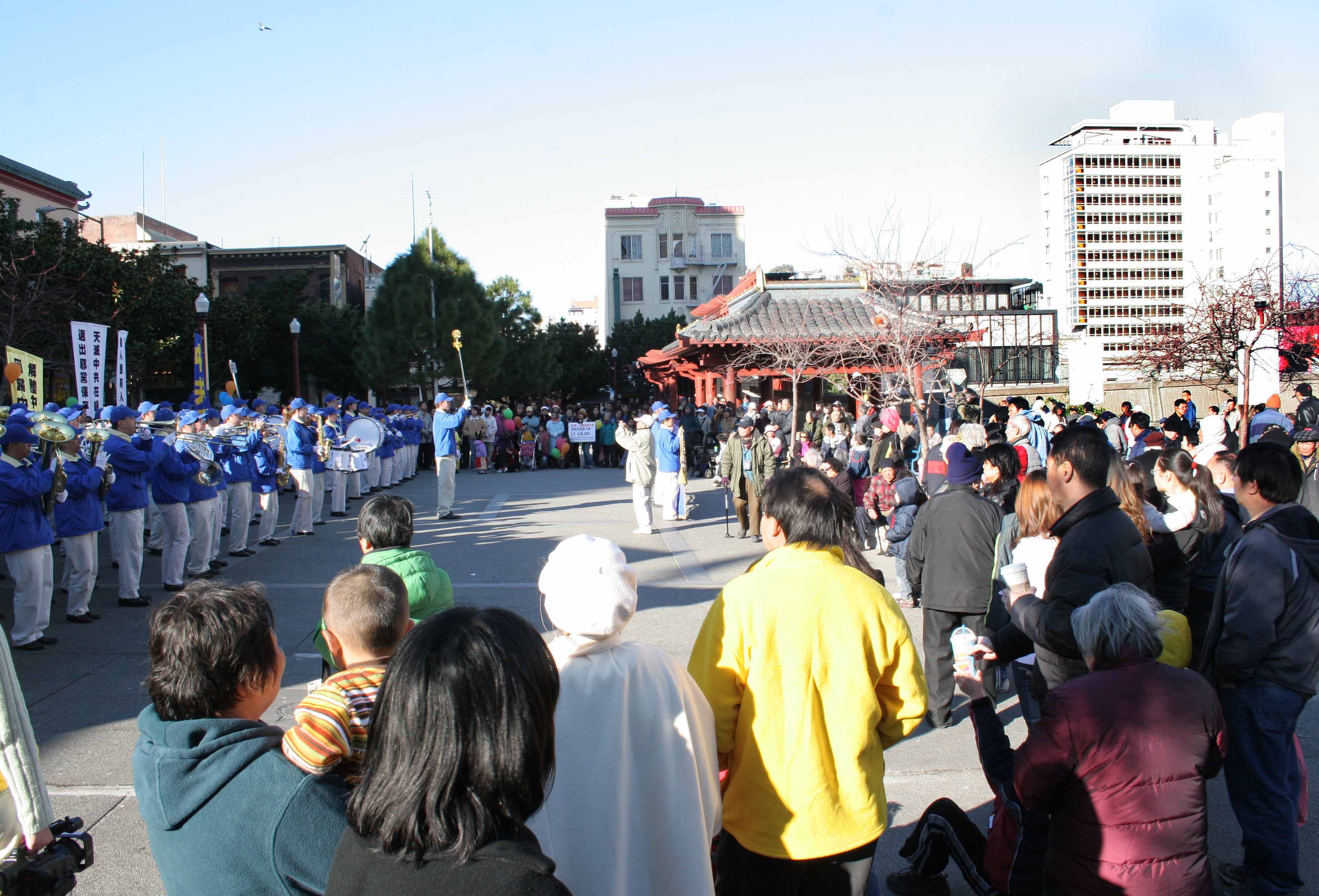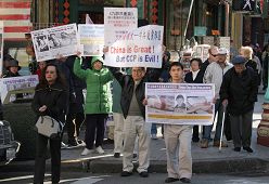 ![]() 集会当天,众多来往游人对法轮功学员的表演所吸引,将中国城花园角广场围的水泄不通。 |