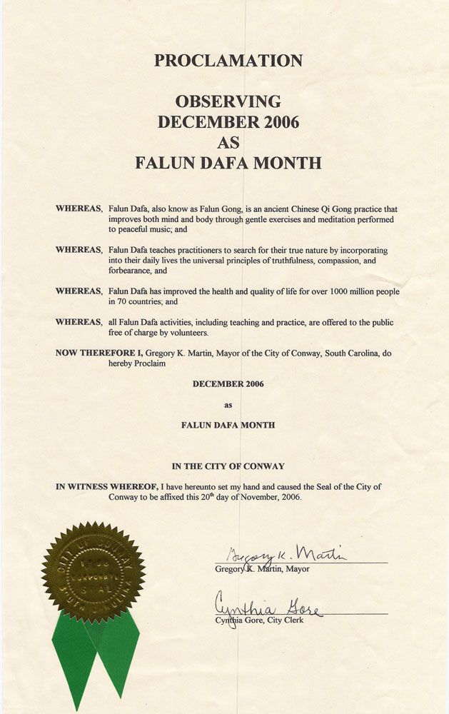 因此,我,格雷戈里·马丁(Gregory K. Martin),南卡罗来纳州康威市(Conway)市长,特此褒奖二零零六年十二月为康威市法轮大法月。