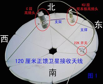 按照图上介绍的,在支架的小圈安上“KU段双本振高频头”,从C段高频头的边到KU高频头的中间,距离是28厘米,方向基本是正东,极化方式为垂直,对向天线的角度基本和C段高频头平行,KU高频头的前平面比C段高频头的前平面位置高约1-2厘米。把接收机接在KU高频头上,用遥控器设定参数:本振频率:09750、下行频率:11334、符号率:06511、极化方式:垂直、22K:关……。边看“信号质量”的多少,边慢慢转动KU高频头的方位和上下位置,直到找到最佳信号质量,定住支架螺丝,按遥控器“确认”或“OK”。