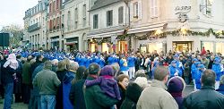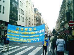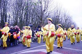法轮功学员的功法演示、天国乐团、传统舞蹈、唐装表演、腰鼓队、法轮旗、退!党!横幅等组成的强大阵容给市民们带来了法轮大法的美好、带来了节日的惊喜,也带来了法轮功被中共残酷迫害的真相。
