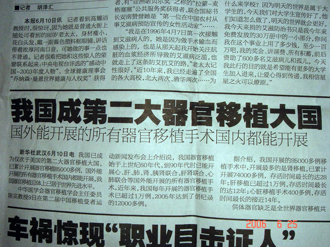 二零零六年的十月、十一月,十二月移植手术不断,有移植肝脏、肾、胰,其中移植肾的病人较多。病人有日本,越南,巴基斯坦、叙利亚等地来的,也有很多是国内病人。