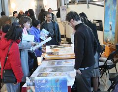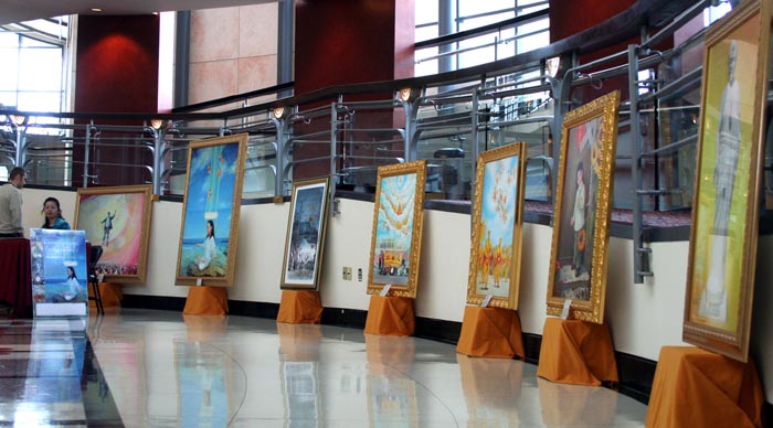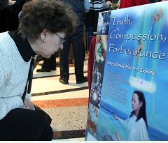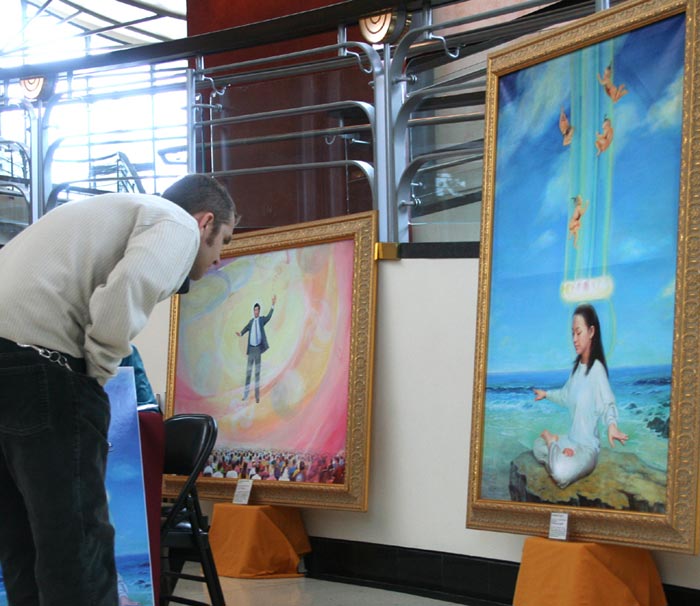 一位华人女士在中场休息时来到画展前说:“看了晚会,更了解了法轮功的美好,还有这些画,你们法轮功真是了不起!我感到很欣慰,还有这么多人在做正义的事。”