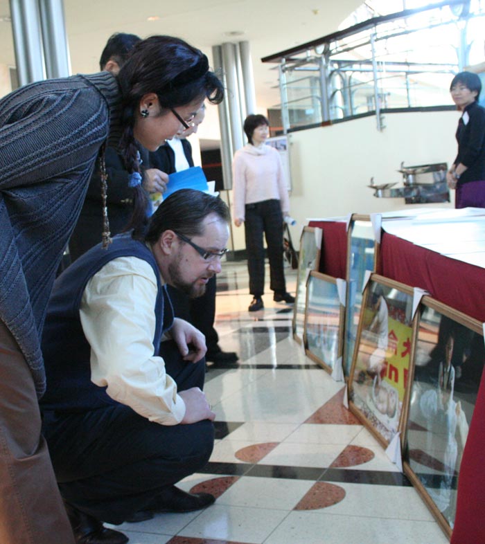 一位年轻的西人女观众非常喜欢油画《无家可归》中的小女孩,解说小姐给她讲了这幅画背后的故事:因中共迫害法轮功,修炼者被抓、被打,或不得不流离失所,他们的孩子在中共的迫害下变的无家可归。听了这些,这位女士的表情变的悲伤起来,立即买下了此画的印刷品。