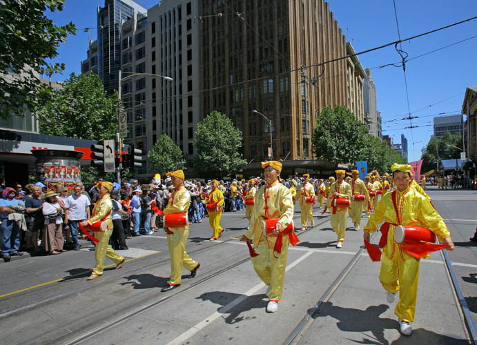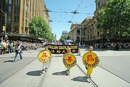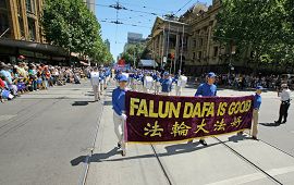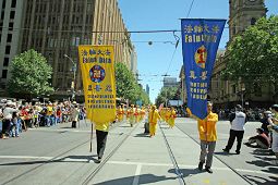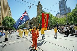 游行前,举行了庄严的升旗仪式,维省总督大卫·德·克里斯尔(David de Kretser)发表了国庆日演讲。随后总督、维省省长布莱克斯夫妇以及维省反对党领袖贝利欧等政要,欣赏了盛装游行,来自墨尔本城乡六十多个社团的近千人,身着代表各自民族的亮丽服饰,向市中心干道两旁拥挤的人群展示着各自的传统文化,其中由男女老幼各年龄段中西人士组成的法轮功队伍最为壮观。