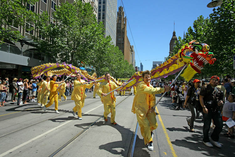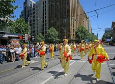 由悉尼天国乐团打头阵,唐装舞、扇子舞、五套功法演示、彩绸舞、腰鼓队,色彩斑斓,充满欢快、喜庆和祥和,观众不时报以掌声和欢呼,很多人还竖起大拇指。利用过去几个月中仅仅周末时间的准备和训练,法轮功舞龙舞狮队首次面对观众,队伍中大部份是高大的西人学员,他们不断变换造型,配合默契。这也是整个游行队伍中唯一的一条中国龙,在法轮功队伍的最后压阵。