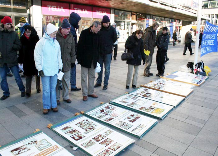 行人们纷纷停下脚步,看展板,索取资料。两个华裔青年听了中共活摘法轮功学员器官的事情感到很震惊。临走前两人作中国传统的合十手势,表示对学员的敬意,他们要带回中文报纸给父母亲看。一个瑞典人急步经过,开玩笑说中国人这么多,杀几个好。义工耐心的告诉他中共杀害了八千万老百姓,现在还活摘法轮功学员器官的事实,他的眼神严肃起来,说太可怕了!他又走到展板前仔细看起来。