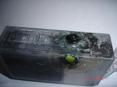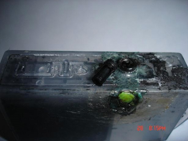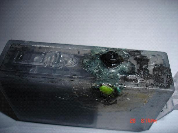 1.废墨盒用小刀将墨盒盖切割开(参考2006-12-28喷墨打印机快速加墨)镊子夹出大海绵泡白。里面有5毫米大小海绵拿出泡白,翻过来装進(有圆形印记是使用过)再装入大海绵封上胶带。我用此方法废墨盒又能使用。下面两种方法还没有试验,因为我的墨盒还没用到此程度,大家可以试试。