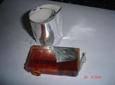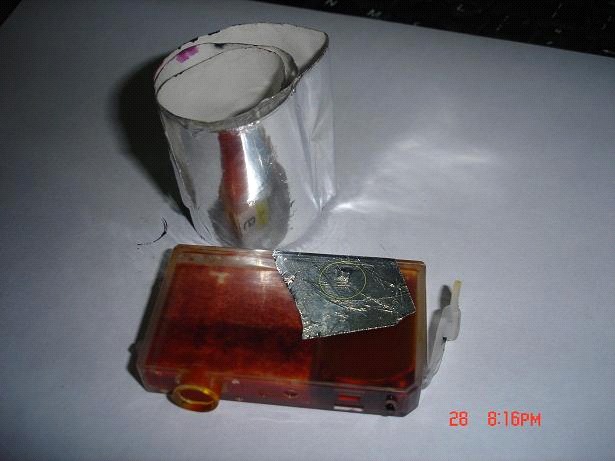 这种方法是在墨盒的侧面打孔,再用图中的胶纸粘贴就行了,效果比用透明胶强多了,这种胶纸是用于包空调引水管道的,在电子市场或水暖器材处可以买到。