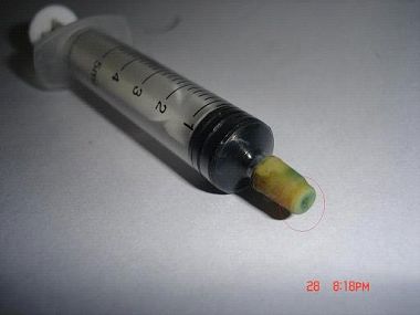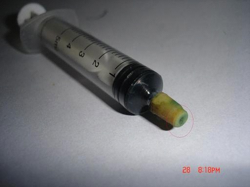 前二图是利用水笔芯的顶端改制的,先将墨盒打孔,再用万能胶粘上水笔芯的顶端。加墨水时,将墨盒立起来,再将笔塞取下,加入墨水,再塞紧就行了。