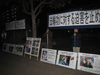 学员们在中领馆的正门前拉开“立即停止对法轮功的迫害”、“制止中共活体摘取法轮功学员器官”等醒目的横幅,横幅的两侧放着揭露迫害事实的展板,吸引了来回车辆以及行路人。