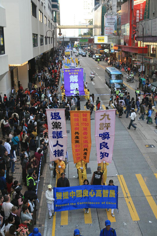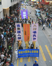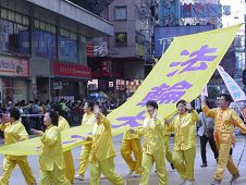 ![]() 游行的法轮功学员向马路两旁的民众挥手 |