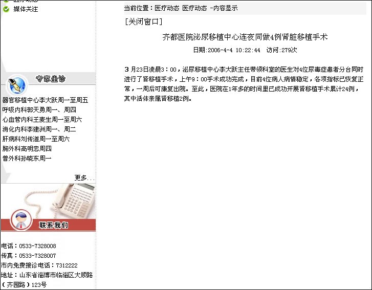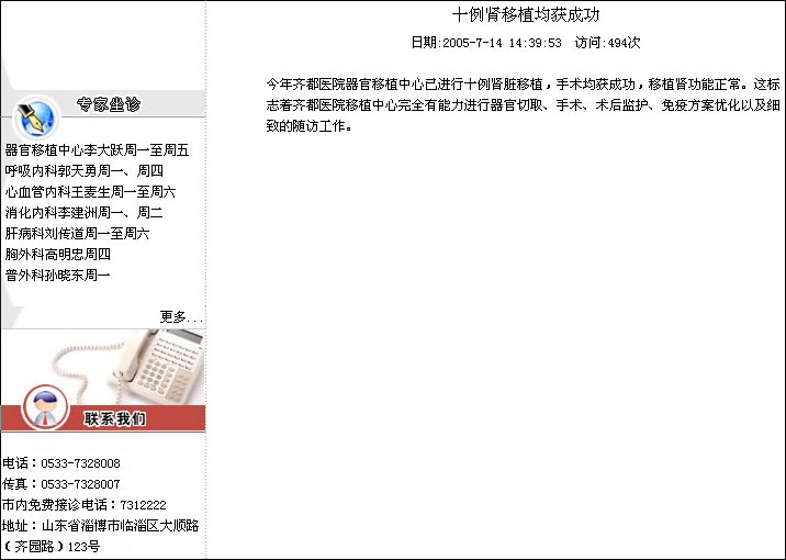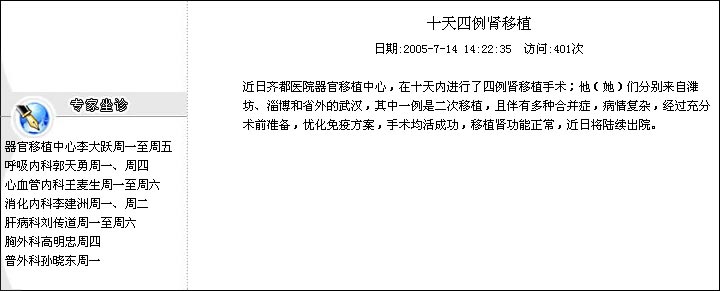 3.2005年7月14报道,“近日齐都医院器官移植中心,在十天内进行了四例肾移植手术;他(她)们分别来自潍坊、淄博和省外的武汉,其中一例是二次移植,且伴有多种合并症,病情复杂。”