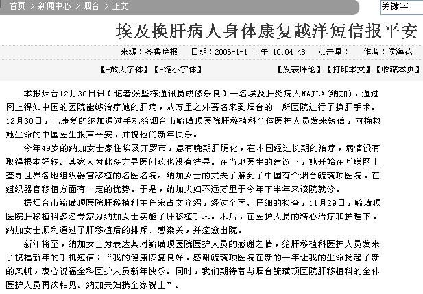 《齐鲁晚报》烟台2005年12月30日(记者张坚栋通讯员成修乐良)报道,2005年下半年,烟台市毓璜顶医院为患有晚期肝硬化的来自埃及开罗市49岁的纳加(女)换肝。