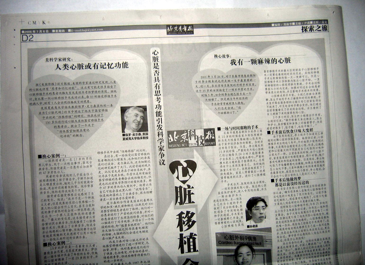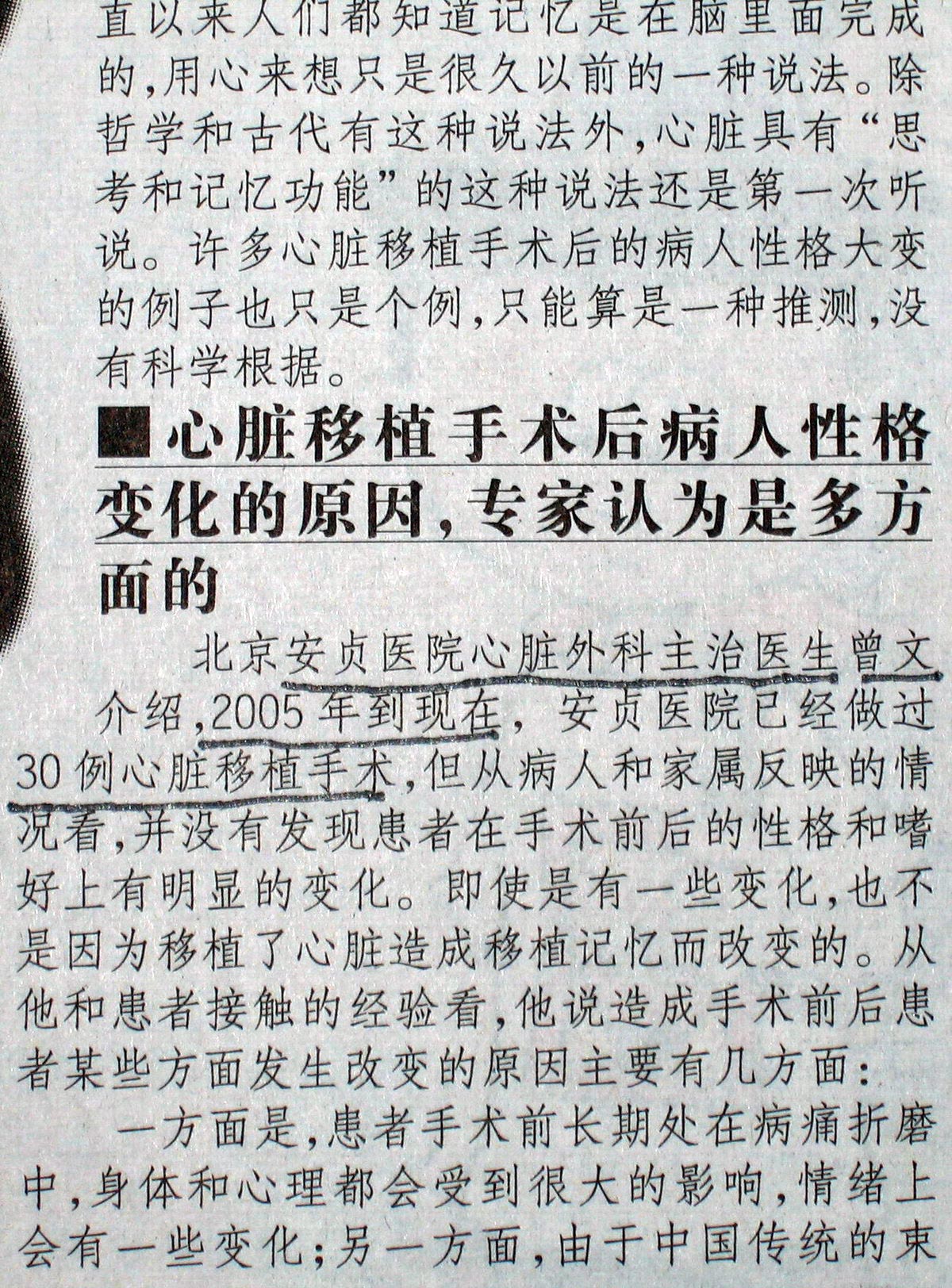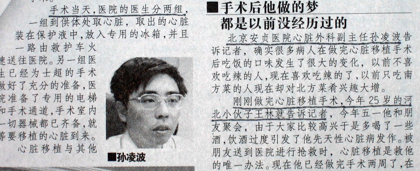 另外,2006年7月左右,北京安贞医院刚刚给一个叫王林的做心脏移植手术,王林说,手术后他说做的梦都是以前没经历过的。