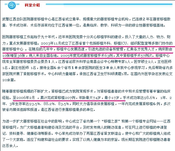 2003年11月,武警江西总队医院成立器官移植中心。在随后的几年中,病床数由10张增至36张,病人来自全国各地。2005年度实施器官移植手术63例,其中肾移植手术57例次。至2006年2月,武警江西总队医院累计实施肾移植207例。但各种移植手术的供体者身份一直被隐瞒着。