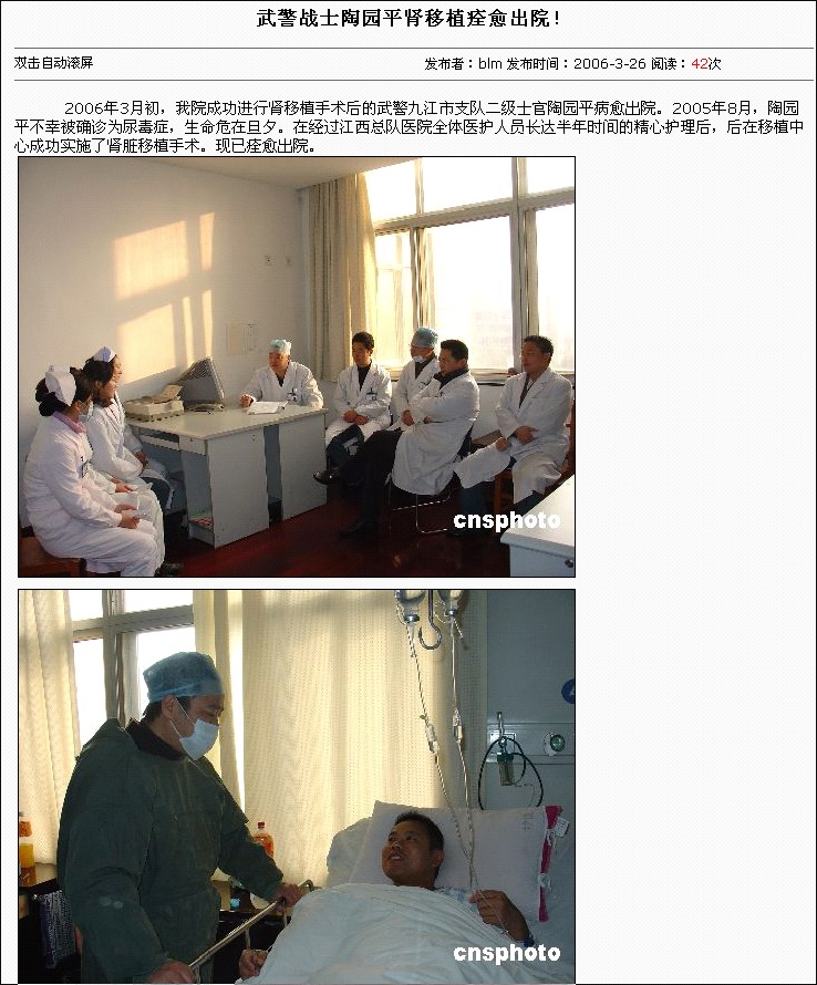 2005年8月,江西武警总队医院对武警九江市支队二级士官陶园平进行肾移植手术,2006年3月初,出院。据报道,半年内医院就为陶园平做了肾移植手术,这在迫害法轮功的1999年之前,是不可能实现的。