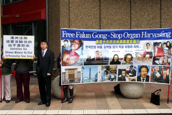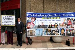 悉尼法轮功学员在法庭外打出真相横幅,揭露中共迫害法轮功和活摘法轮功学员器官的暴行。很多路过的悉尼市民被迫害真相震惊,纷纷接过传单了解更多情况,并对法轮功学员表示支持和同情。