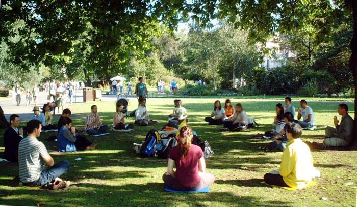 ![]() 法轮功学员在摄政公园炼功、发正念。在炼功的人群中,包括当场跟学员们认真学起功法来的路人。 |