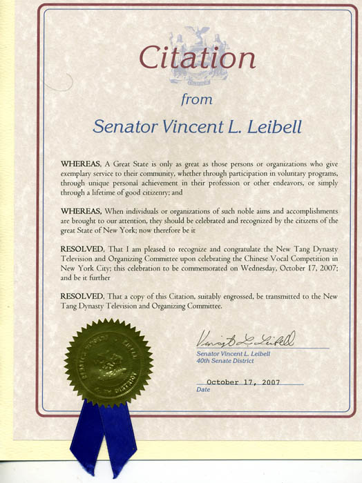 鉴此,我高兴的嘉奖并祝贺新!唐!人:电视台在纽约市举办华人声乐大赛;并将在二零零七年十月十七日星期三予以庆祝。