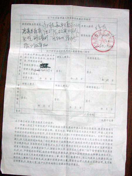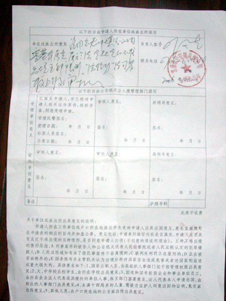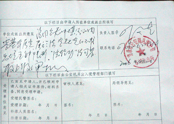 2006年10月,章有亮夫妇在海外的子女因为工作繁忙,担心没有时间照顾小孩,非常希望章有亮夫妇能过去帮忙照顾。于是章有亮夫妇第三次去办理护照。这次,章有亮夫妇填好申请表,派出所和章有亮的工作单位都分别在他们的申请表上盖了章,签了字,并写明了他们的申请被拒绝是因为他们是法轮功修炼者。下面是两人在2006年申请护照时,被拒绝签发护照的护照申请表及拒绝理由。