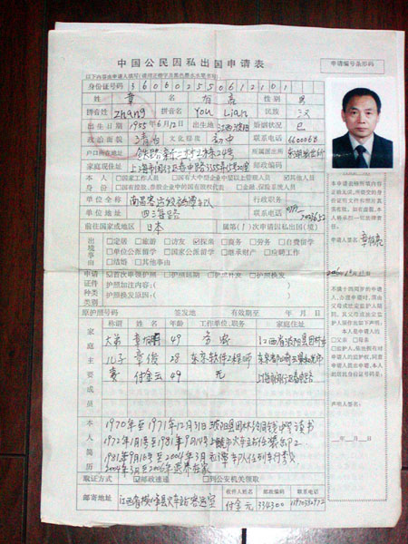 (附章有亮夫妇的护照申请表的照片)