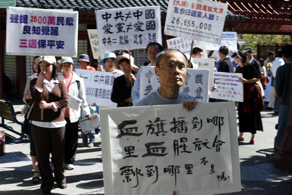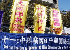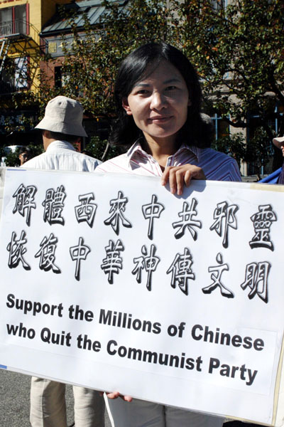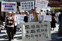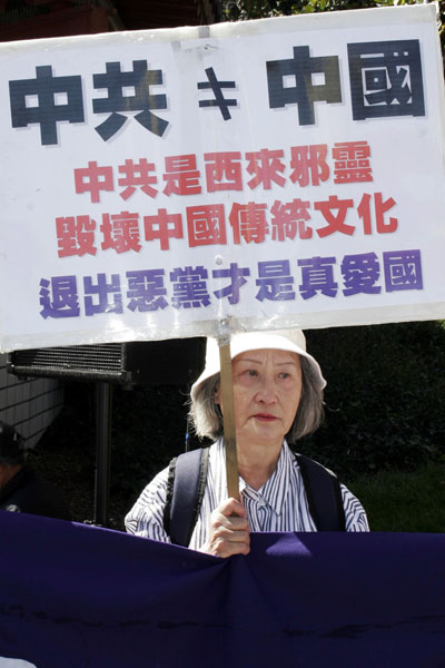 参加集会的民众,在现场展出:“天灭中共”、“广传·九·评*”、退!党!自救“、“声援二千六百万勇士退出中共”、“解体西来中共邪灵,恢复中华神传文明”、“血旗插到哪里,血腥就会飘到哪里,不是吗?”、“中共不等于中国”、“爱国不等于爱党”、“中共是西来幽灵,毁坏中国传统文化,退出恶党才是真爱国”等横幅标语。
