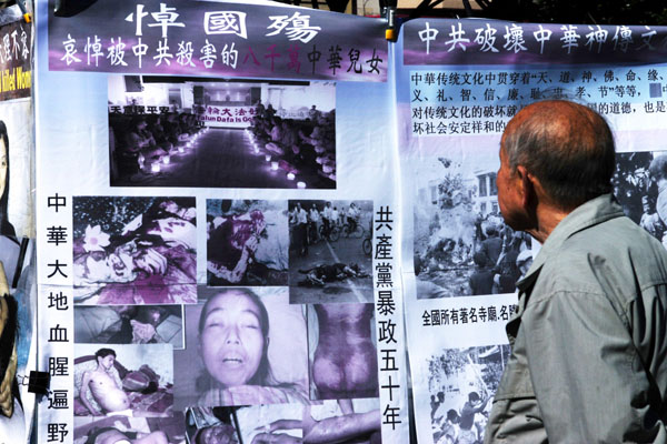 ![]() 真相图片展吸引过往民众驻足认真阅读、了解真相。 |