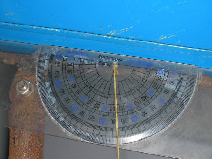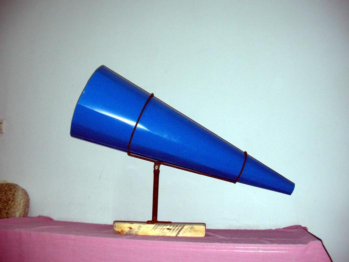 铁皮喇叭筒(直径大口33公分,小口5.5公分),用垂直线找出下筒边至上筒边的垂直差距为12.5公分,转动方位即可。