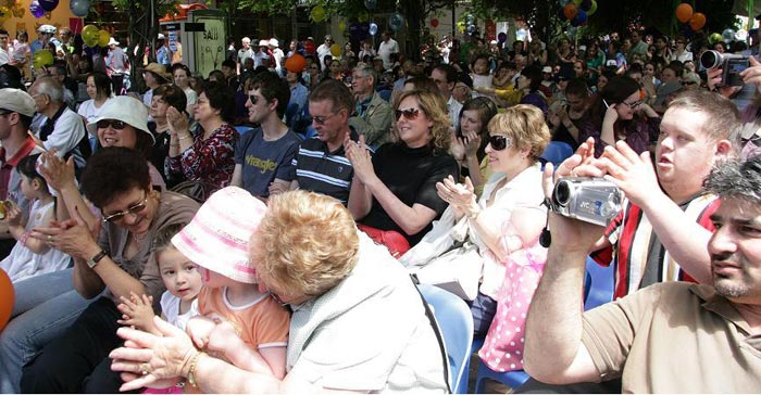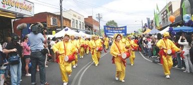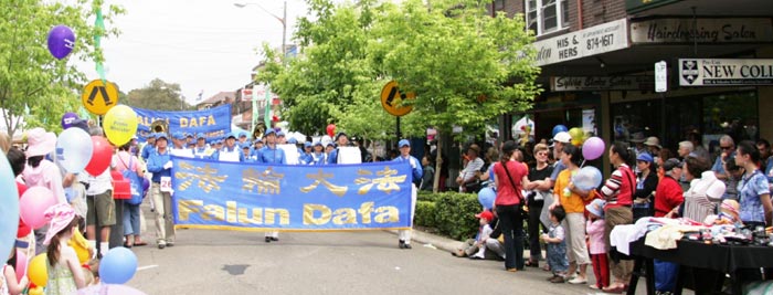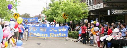 早上十点,春意盎然的街道两旁已人山人海,四十几个具有多元文化特色、代表不同民族社团的游行队伍浩浩荡荡走向主席台。伴随着嘹亮雄壮的“法轮大法好”乐曲和观众的掌声,法轮功游行队伍走近主席台。主持人向观众介绍,“法轮大法是一种气功修炼,亿万修炼者返本归真,获益无穷。以宇宙“真善忍”的特性修炼心性。五套功法,动作缓慢易学,免费教功。炼法轮功会令人感到轻松愉快,使人精力充沛。欢迎大家到伊斯德伍公园炼功点……”游行学员向主席台招手,台上议员和总理霍华德向法轮大法游行队伍挥手致意。