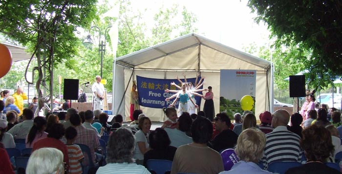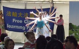 由于法轮功往年精彩的舞台表演,主办单位安排学员们在最佳时段(紧接游行结束后)和最好的舞台。短短十五分钟,节目紧凑而丰富多彩,由西人学员介绍,首先以西人学员创作的弘扬大法的歌曲为伴奏,五位青少年学员翩翩起舞,紧接着是象征圣洁和坚韧不屈的莲花舞。一位四五岁小女孩、一边看一边模仿舞者优美的手势。
