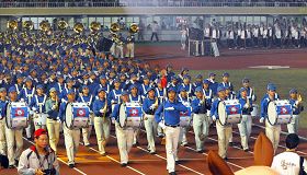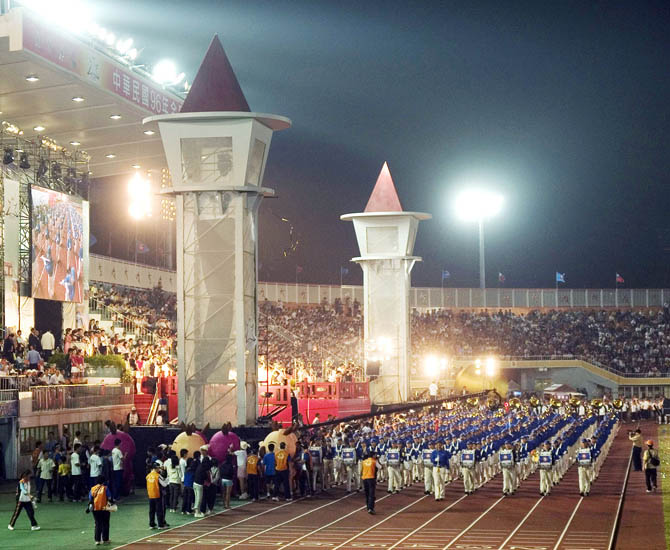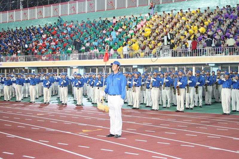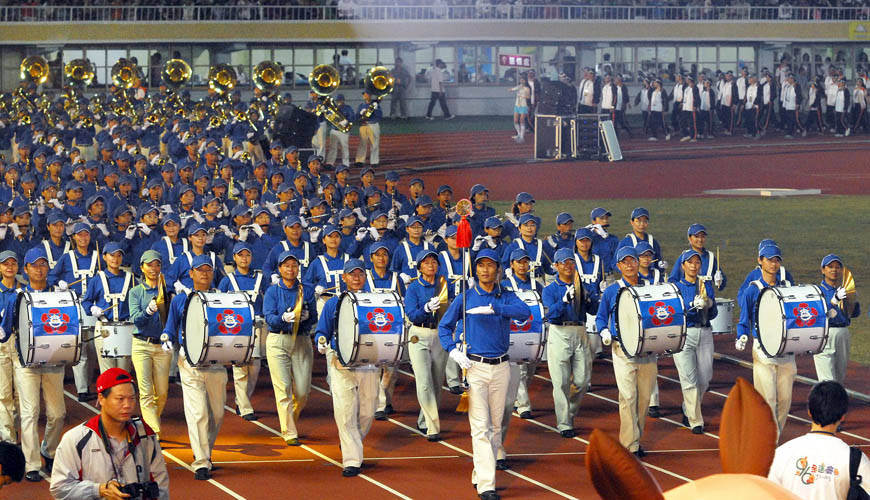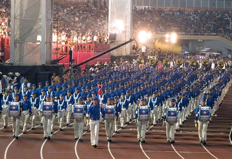 当台湾天国乐团行经主席台前时,司仪报告说:「各位贵宾,现在引领全运会全部运动员进场的是全国第一大鼓号乐队──『天国乐团』,请大家给予热烈掌声鼓励!天国乐团是由一群来自社会各行各业修炼真善忍的伙伴所组成,他们希望经由他们所吹出来的乐音,为世界带来光明美好,祝大会圆满成功!」