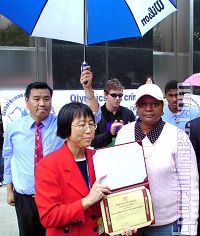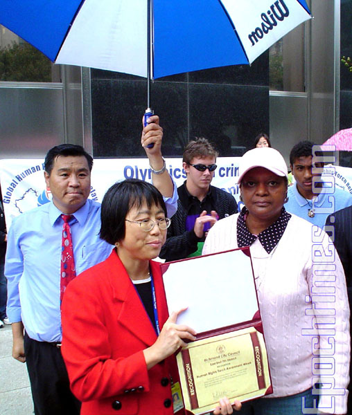 ![]() 维吉尼亚州瑞曲曼(Richmond)市议会副主席麦克奎恩女士(右)代表瑞曲曼市议会颁发褒奖状给美东中区人权圣火全球传递(HRTR)及法轮功受迫害联合真相调查团(CIPFG) |