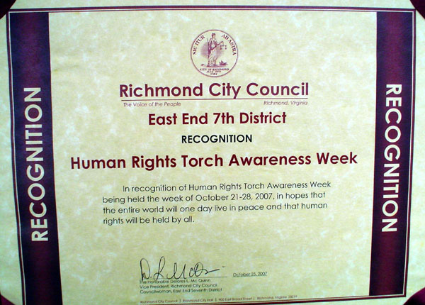 ![]() 维吉尼亚州瑞曲曼(Richmond)市议会颁发给美东中区人权圣火全球传递(HRTR)及法轮功受迫害联合真相调查团(CIPFG)的褒奖奖状。 |
