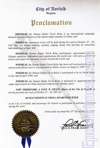 ![]() 维吉尼亚州诺佛克市(Norfolk)保罗•佛莱莫(Paul D. Fraim)市长给“全球人权圣火传递”的褒奖奖状 |