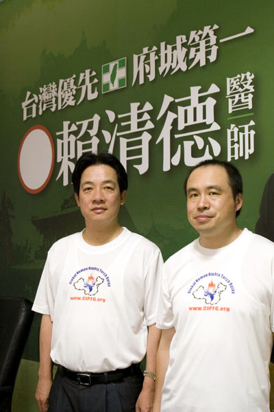 ![]() 日本法轮功受迫害真相联合调查团亚洲分团副团长安东干,拜访CIPFG的亚洲分团团长立委赖清德(左) |
