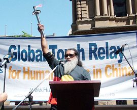 他表示,当中国被授权主办奥运时,曾承诺尊重奥运的精神,但中国许多法轮功学员因为他们的信仰而被杀虐,他们的肝、肺、肾被摘取被牟取高利,联合国酷刑专员的二零零七年报告中提出了中国监狱内存在惨无人道的酷刑折磨和活摘器官的暴行,在二零零八年奥运前,我们要求中国政府停止迫害法轮功、停止活摘器官、停止所有对人权的侵犯,释放因支持人权被迫害的人权律师高智晟。让我们确保奥运和反人类罪不能同时在中国进行。