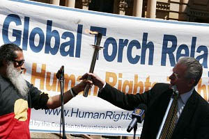 ![]() 市议员约翰(John Mcinerney)代表悉尼市从多米尼克手中接过人权圣火 |