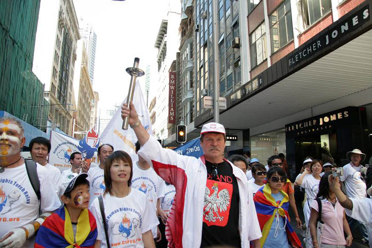 第一位圣火传递大使是绿党参议员凯瑞•纳什,她从萨瓦•欧司岛斯基博士的手中接过了火炬。人们开始形成一个火炬接力的长龙,沿着悉尼的乔治街,向悉尼的第二站环形码头前行。来自新西兰的全国维权抗暴连线的海外发言人潘晴从凯瑞•纳什手中接过火炬。