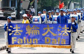 为期六天的竞赛之后,二十五日下午由台南市长许添财率领亚、奥运选训优秀选手车队游行,并再度由天国乐团为游行队伍之前导,游行路线从市立体育场大厅前广场出发,终点到达台南市立文化中心,随后举行闭幕典礼。市长许添财在行进间向法轮功学员竖起大拇指盛赞天国乐团。