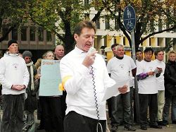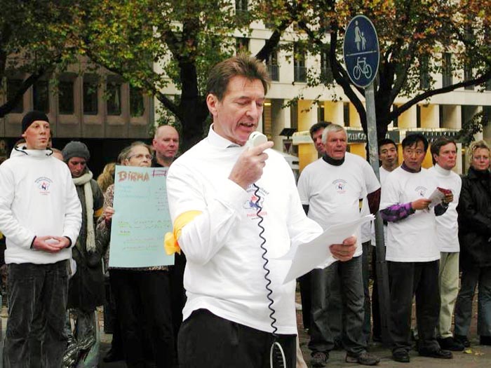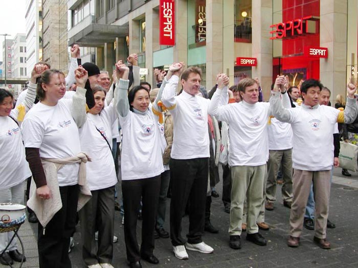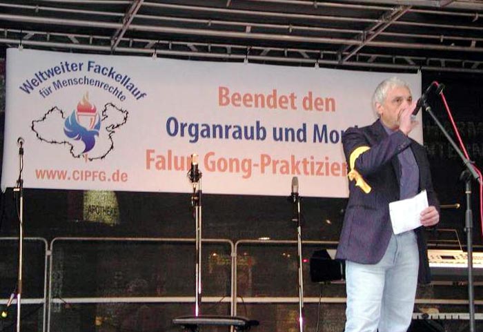 北莱茵-西伐伦人道主义协会(Humanistischer Verband NR)的考赫先生做了慷慨发言,他说:“对中国发生的活体摘取法轮功学员器官的罪恶,这种丧失人性的罪行,这种野兽行迹,我感到无以言表的震怒和愤慨。作为一个体育爱好者,我非常支持对二零零八年北京奥运的抵制。呼吁所有的人都参与进来,此时此刻,不要犹豫!我也希望,这个人权圣火传递活动能够惊醒政治、经济和体育界的权威们,促使这个邪恶的行径尽快结束!”
