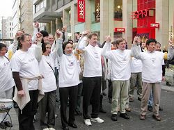 下午两点半人权路跑起跑。参与人员有来自德国各地的民众,也有来自荷兰和比利时的民众,还有两位在德国大学学习的美国女大学生。大家通过不同的信息渠道,如同事、亲友或者是传单和上网,获得了此项活动的信息,认为应该支持,就来了。他们想通过亲身体验人权圣火路跑,并在今后将捐购的有人权圣火标志的T-恤衫展示并讲给其他人,以共同制止在中国的人权迫害。