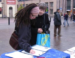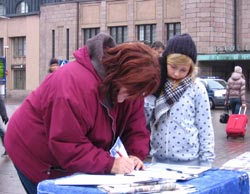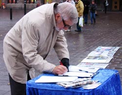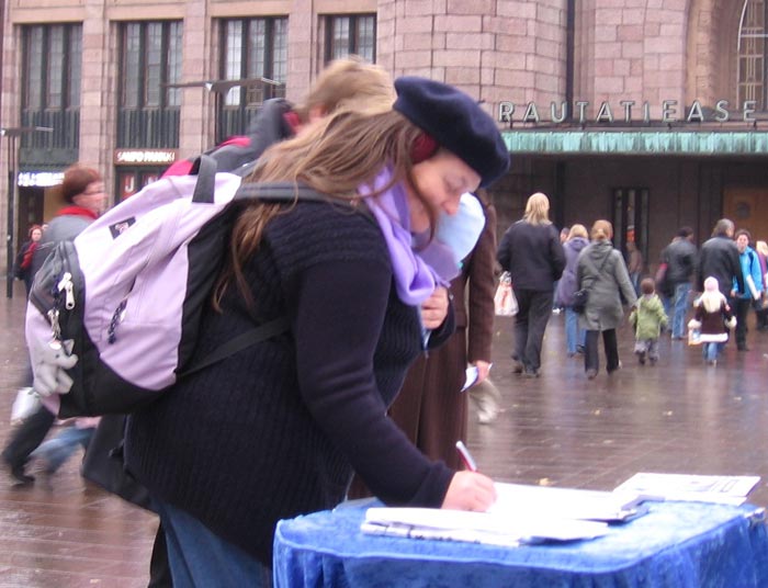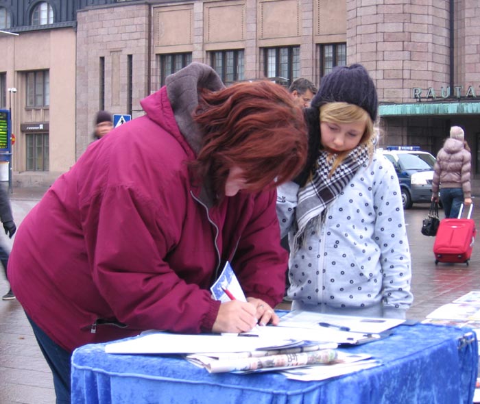 一位芬兰男士默默的前来签名,然后又好象在寻找更多的资料,学员递给了他一些打印的详细资料。接下来他就认真的看起展板,该学员拿着英文的《·九·评*共产党》,用自己掌握的简单英语问他,如果你想知道中共为什么迫害法轮功,你可以读读这篇文章。他欣然接受了,接着继续看展板。后来一位会说芬兰语的学员和他交谈时,他说,这是一件非常悲惨的事,居然发生在中国。一个国家怎么可以迫害这么大的一个群体。