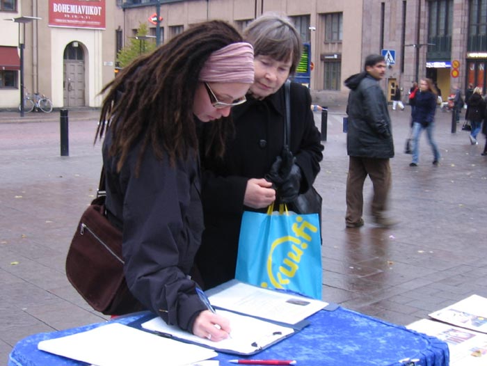 当学员向一位芬兰老者递传单时,老者用中文说:“你好!”然后说他两年前去过中国,他知道法轮功被迫害,很残酷。接着走到征签桌前签名声援法轮功。