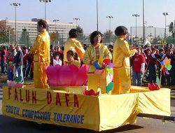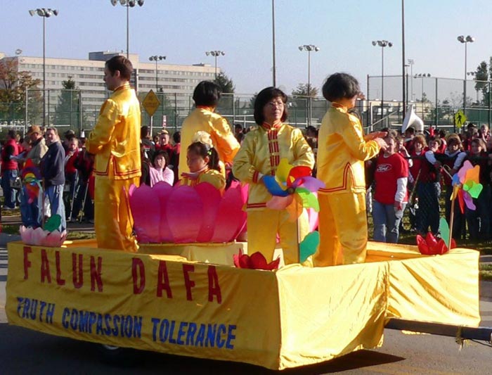 法轮功学员是第一次在这所大学的返校节露面,伴随着音乐“普度”,花车所经之处,观众们都睁大了眼睛,兴奋而又喜悦的喝彩。看到打横幅的学员穿的仙女服时,很多观众赞叹:“好美啊!好漂亮的服装!” 一个美国学生双手合十,用中文大声的对法轮功学员说, “你好!” 一个可爱的小朋友在远处伸手拽着父母的衣服,指着法轮大法的队伍要他们快看。很多观众伸出手来,等待发资料的学员将介绍法轮功的传单送到手中,接到传单后他们纷纷表示感谢。游行后马上就有人打电话询问要学功,还有人打电话想要更多的了解这个功法。