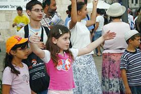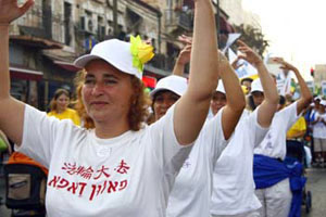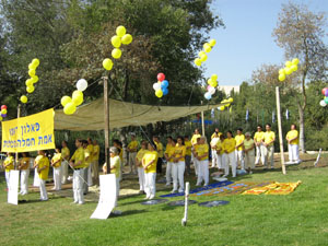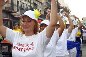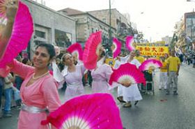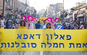 ![]() 法轮功学员的游行队伍经过耶路撒冷市中心街道 |