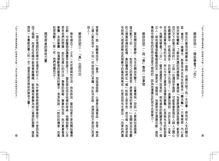 董憓陵的绝妙好招一,开始学会了「忍」:书中的法理让她想到,也许在某一生中曾经辜负了先生,今生才会有这样的磨难。她写道:「这和传统中国女性的任劳任怨是不同的,因为我选择在吃苦中去掉业力。」