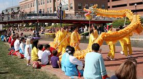 法轮功学员除了入选参加游行之外,还应邀在活动现场摆设展位,向不同族裔民众展示各种语言的《转法轮》,并演示五套法轮功,很多游人纷纷索取法轮功真相资料。中午游人最多的时段,法轮功学员应邀上台展示功法,并表演舞龙、舞狮和腰鼓。