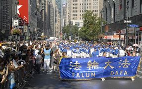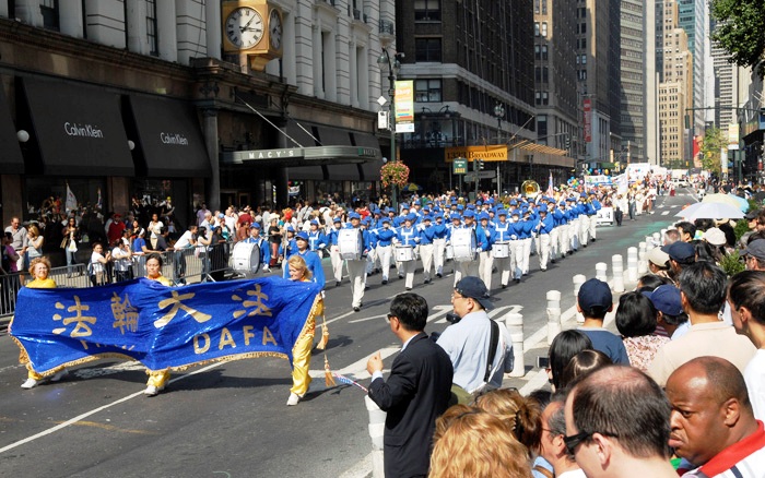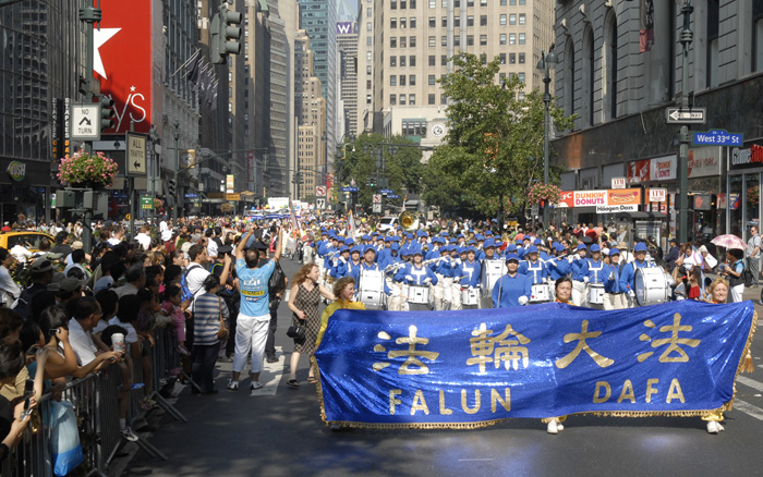 “韩国日”游行多姿多彩,花车、舞蹈、鼓乐、造型,充份展示了韩国文化的丰富多彩。参加的天国乐团,以他们纯正的风貌、昂扬的精神、雄壮的乐曲,给这个繁忙的世界之都注入了一股股清流,纯正纯善纯美的生命之泉。“法轮大法好”、“法鼓法号震十方”、“送宝”等嘹亮的乐曲回响在百老汇大道的上空。